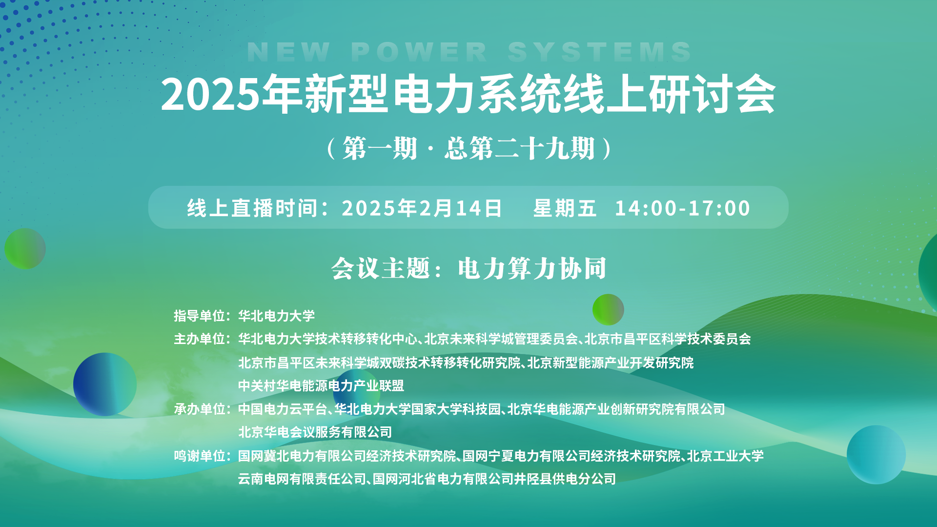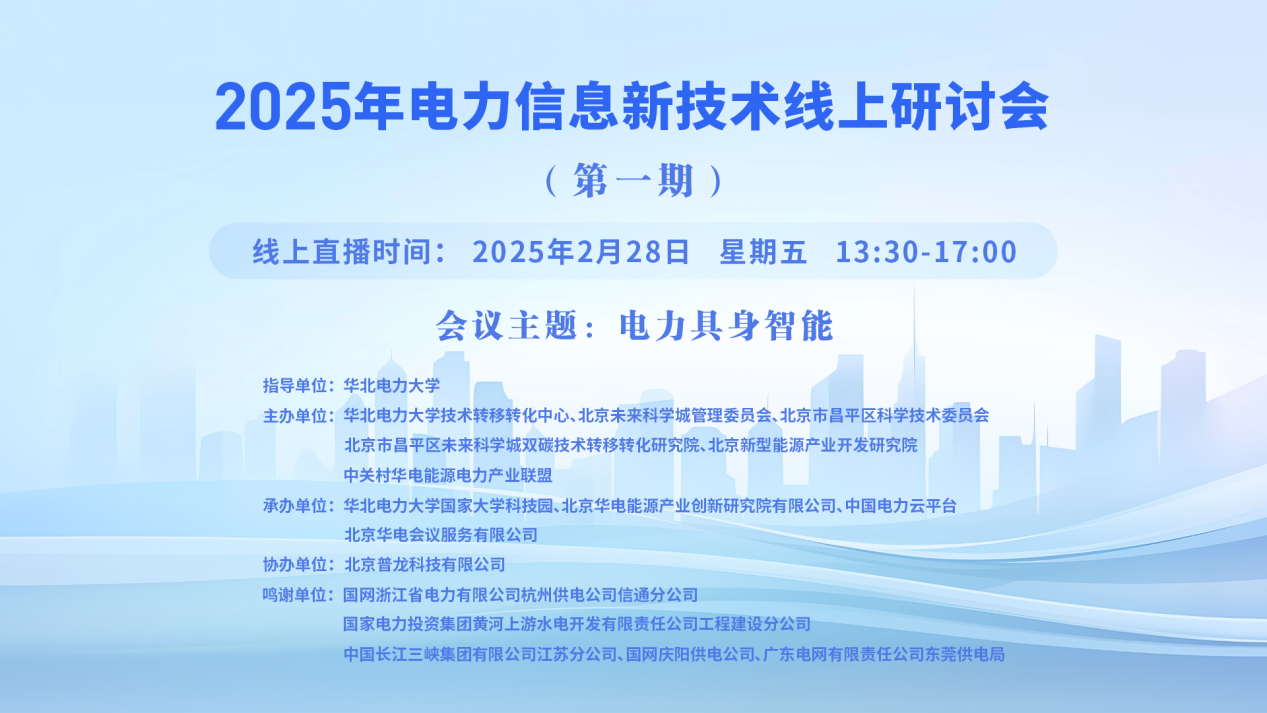2025年新型电力系统线上研讨会(第一期·总第二十九期)一、讲座主题:电力算力协同 二、讲座时间:2025年2月14日 星期五 14:00-17:00 三、讲座地点:线上直播:https://wlwth.xetlk.com/sl/4CqKTT(联系人刘敏13331120445) 四、主讲人信息: (一)主讲人:岳昊 主讲人简介:岳昊,博士,教授级高级工程师...主讲人:岳昊、赵利宁、丁肇豪、周峰、高啸、李申章时间:2025-02-14 14:00地点:线上讲座 -