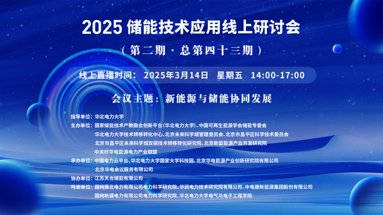 2025年储能技术应用线上研讨会(第二期·总第四十三期)【讲座主题】新能源与储能协同发展 【讲座时间】3 月 14 日 星期五 14:00-17:00 【讲座地点】https://wlwth.xetlk.com/s/zaW1D 王航杰15321299518 1.【主讲人】王泽森 国网冀北电力有限公司电力科学研究院电网技术中心高...主讲人:王泽森、孙鹏、孙鹏、孙亚冰、张智 、亚夏尔·吐尔洪 刘峻时间:2025-03-14 08:20地点:线上讲座 -