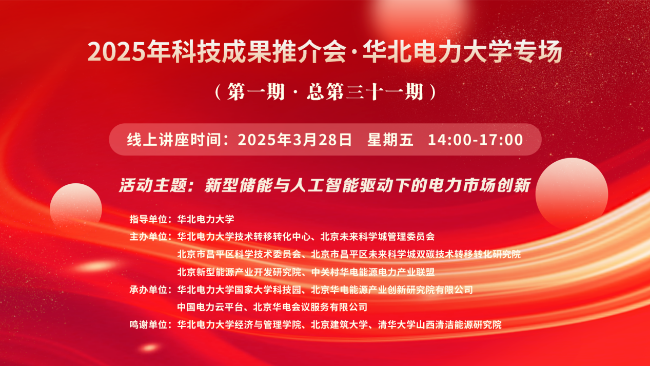 2025年华北电力大学科技成果推介会(第一期·总第三十一期)【讲座主题】新型储能与人工智能驱动下的电力市场创新 【讲座时间】3 月 28 日 星期五 14:00-17:00 【讲座地点】https://wlwth.xetlk.com/sl/16Ue76 王航杰15321299518 1.【主讲人】谭忠富 ...主讲人:谭忠富、董福贵、许儒航、秦光宇、凡航、许士琦、时间:2025-03-28 14:00地点:线上讲座 -